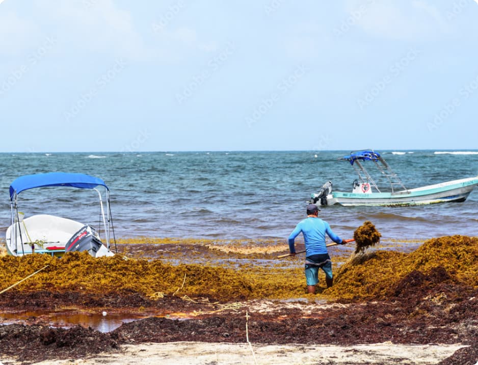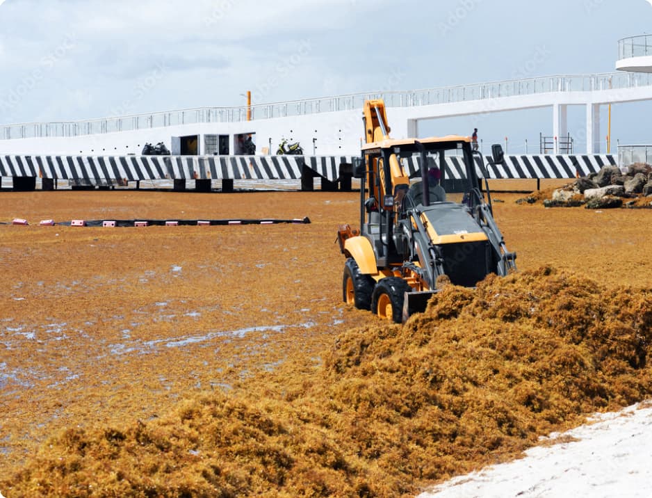 In Northern Mexican Caribbean, hotels spent between US$ 0.3—1.1 M/year/ per kilometer of beach to keep them in suitable conditions*. Most communities are forced to tackle the seaweed after it washes up on shore, using bulldozers and rakes to clean it up. It's a tough, expensive job that needs to be done every day and leaves piles of rotting seaweed to deal with.